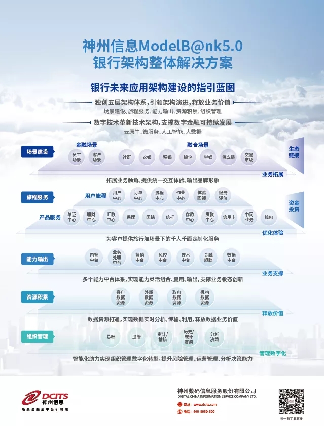 在中国银行业40余年的科技创新发展历程中,神州信息通过发布5代ModelB@nk银行架构整体解决方案,始终指引中国银行业的IT架构整体设计和规划。神州信息是国内最早从事整体IT架构研究的金融科技厂商,ModelB@nk1.0于2000年初始发布,到2015年演进到了4.0版本。来到2021年,历经六年打磨规划的5.0版本积极拥抱金融数字化发展新趋势,通过对未来IT架构的整体规划设计,帮助银行建立符合自身特点的以及信创要求的技术和应用体系,助力业务快速发展与安全运行。
